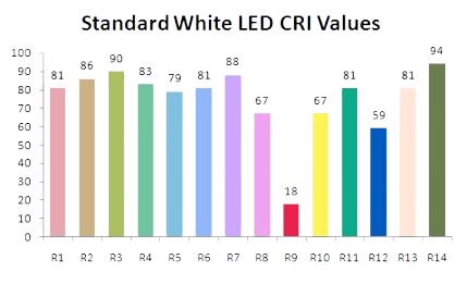 CRI R9 red is a very important metric because most LEDs are lacking in red content, but this fact will be hidden due to the averaging out of CRI calculations which do not include R9.